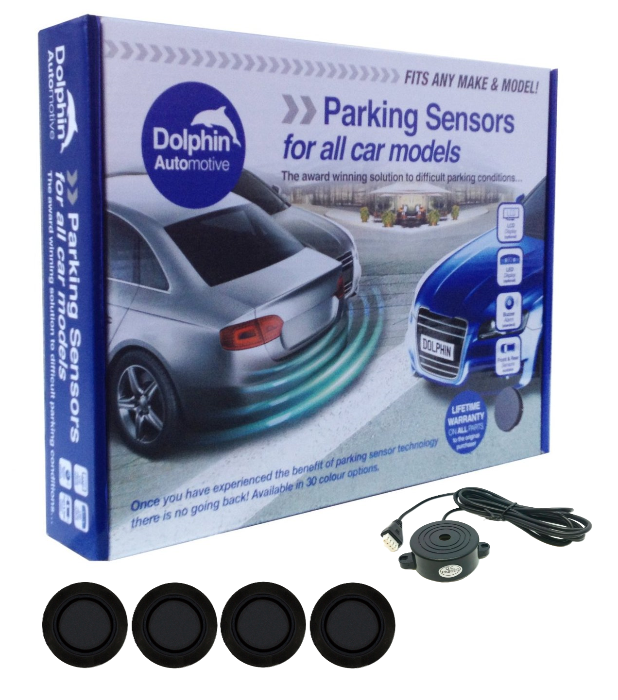 Designed for the front of the vehicle, the Dolphin Micro Parking Sensor kit comes with 4 recess mounting sensors. With an audio buzzer which beeps with increased frequency the closer you get to an obstacle. Detection range starts at 1.25m and gets you to 30cm at which point you get a continuous tone to alert you to stop. The buzzer is nice and loud and can be discreetly mounted somewhere suitable on the vehicle.